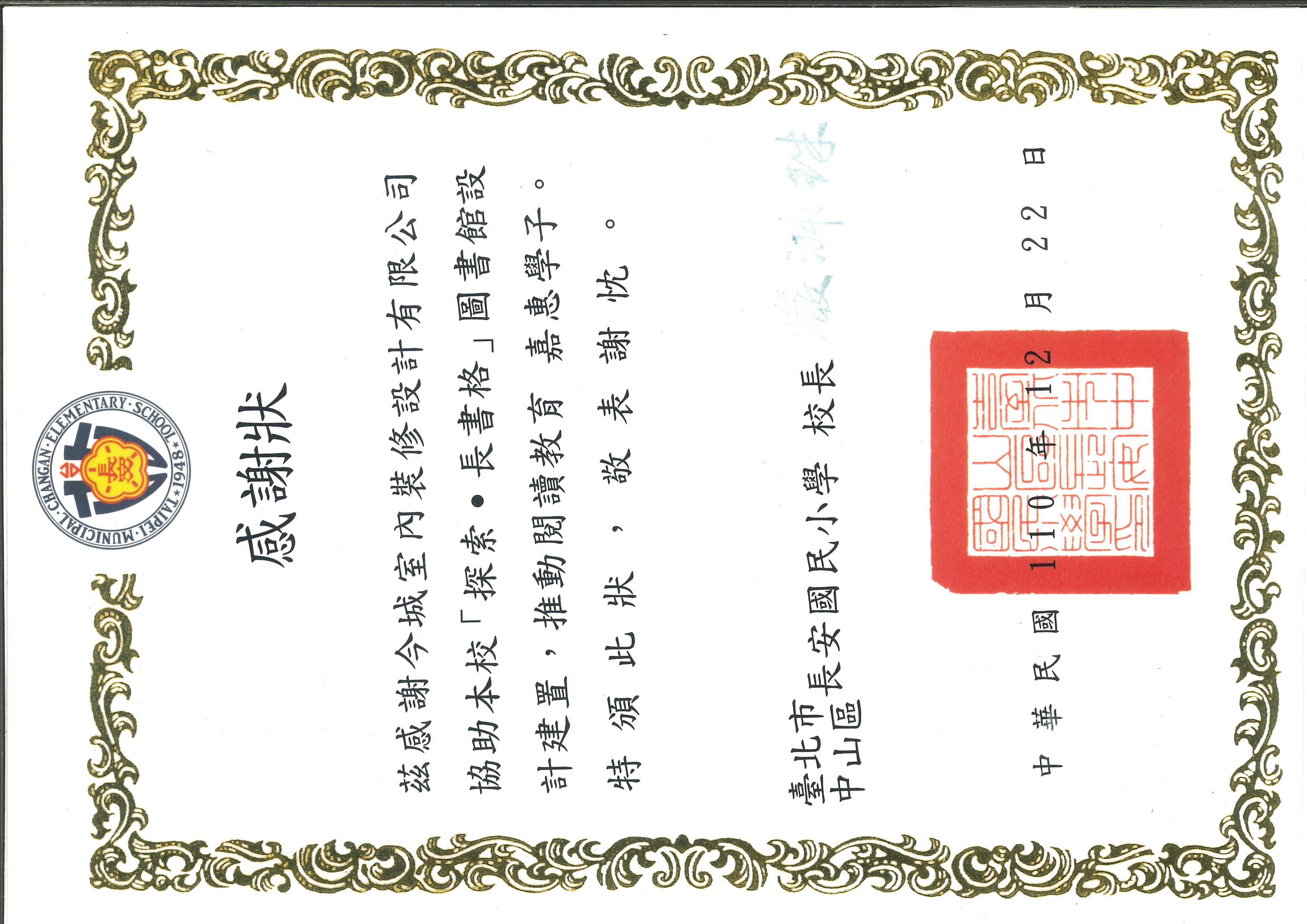 臺北市中山區長安國民小學感謝 今城室內裝修設計有限公司協助學校「探索.長書格」圖書館設計建置,推動閱讀教育 嘉惠學子。