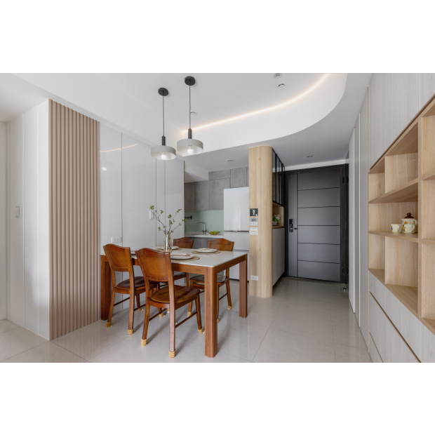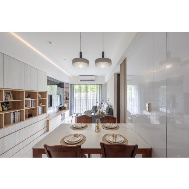期望餐桌能兼作孩子學習區,並提前規劃書籍收納與採光條件;整體空間以自然木紋與白色為主,展現靜謐與清新感。
