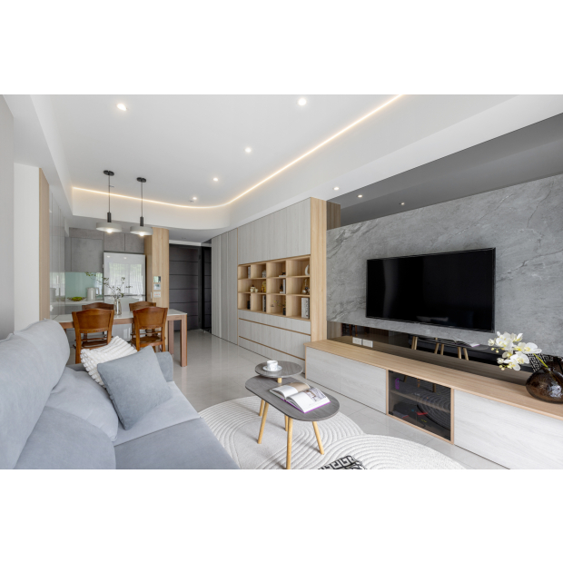 - • 主要建材:系統櫃、壁紙、磁磚、格柵、木紋地板、鏡面