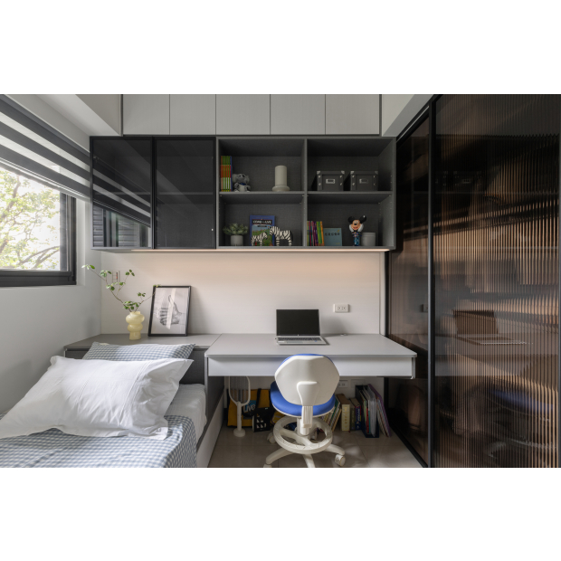 收納配置:全室採垂直式收納,自下而上滿足實用空間,同時維持開放感。