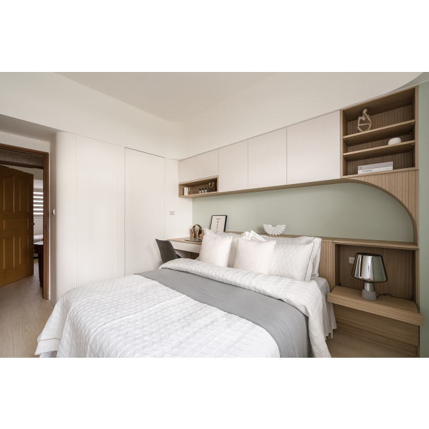 收納與分區:全屋系統櫃到頂並兼作空間界定;以格柵與壁面造型建立視覺秩序與通風感。