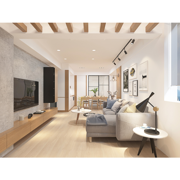 引景入室:以開闊窗幅借景關渡河岸,客餐廳採淺木色 × 霧白牆,建立北歐式明亮基調。