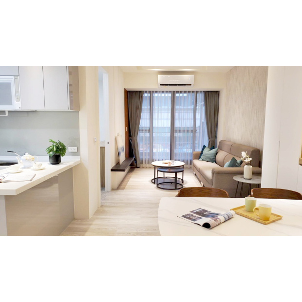 - • 主要建材:木作櫃體、灰鏡、造型鋁框拉門、石塑地板
