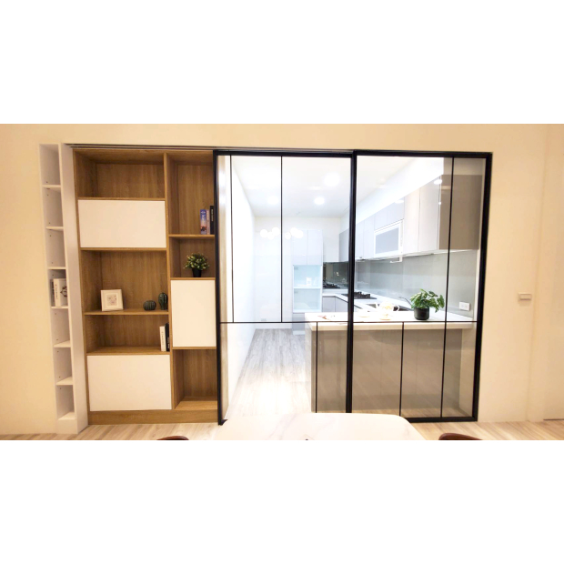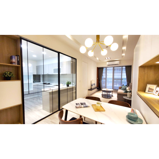 半開放動線:利用造型鋁框拉門與玻璃隔間建立可調節的通透關係,兼顧隱私與採光。