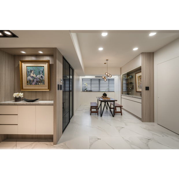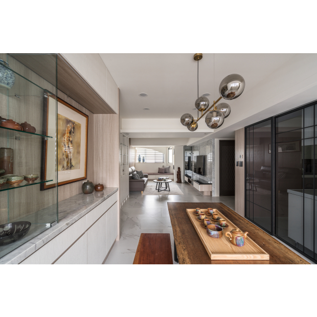 公領域:開闊明亮的客餐廳,需規劃字畫與茶具的展示與收納。
