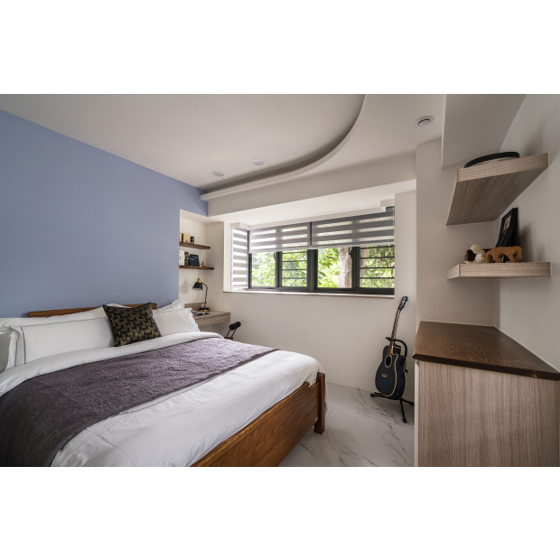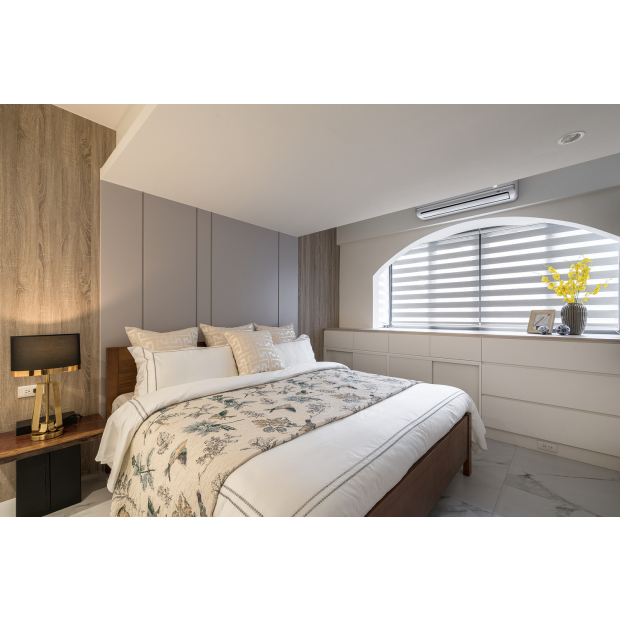 臥室:導入屋主偏愛的莫蘭迪色系,營造沉靜放鬆氛圍。