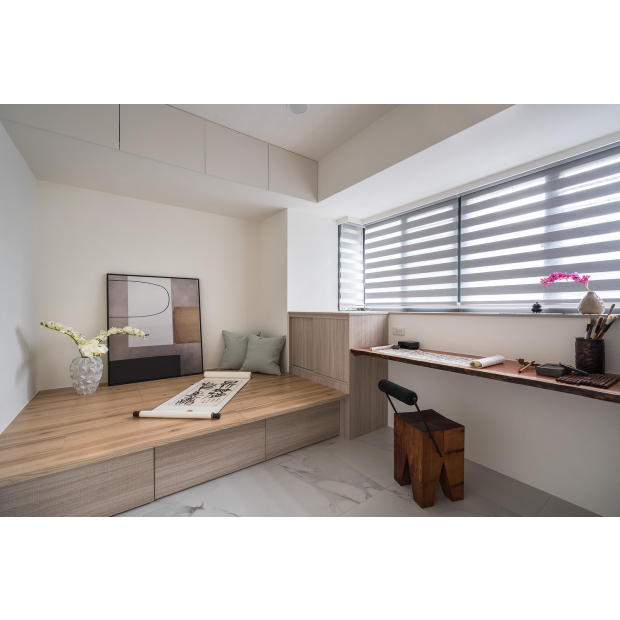 書房:溫潤木紋搭配白色跳色,呼應詩字書畫的文化氣息,可作招待住宿與書法創作。