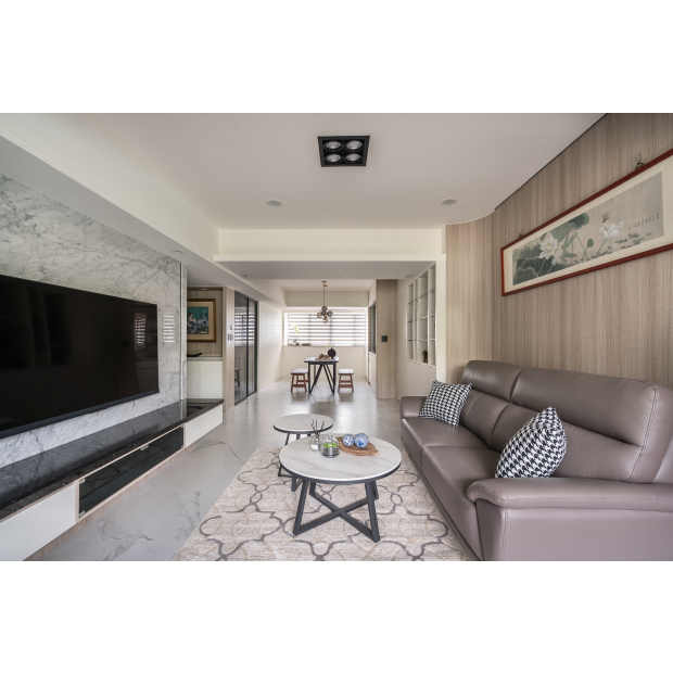 客廳:電視牆採天然石材並以鏡面分割,兼具大器與輕盈;大板磚地坪與懸空電視櫃使清潔無死角。