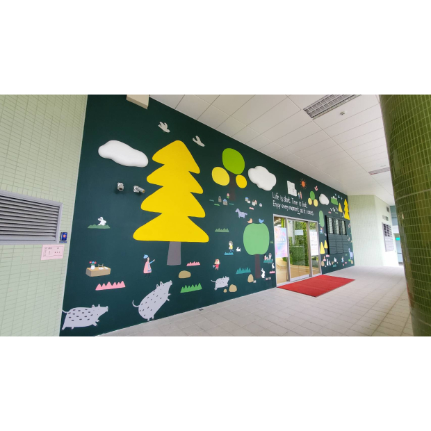不僅有一面藝術家彩繪牆,從單色磁磚牆轉變成童趣十足的門面; 進入大門抬頭有充滿希望的氣球造型燈、轉頭則見綠意盎然的圖書館意象牆, 讓學生在踏入的第一刻就被閱讀的想像力包圍。