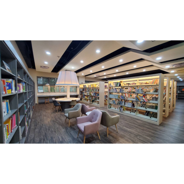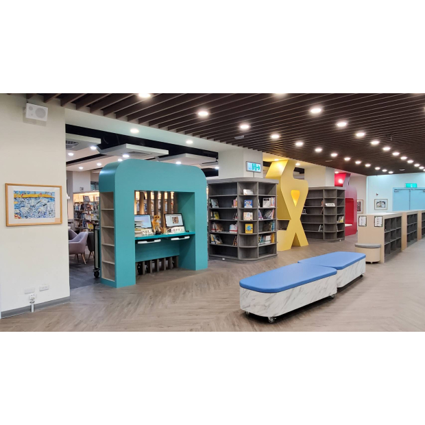 主廊道以 ㄅㄆㄇ 造型書櫃作為設計亮點, 結合放大版檯燈造型閱讀桌,兼具功能與藝術性, 為館內注入活潑創意與親子共賞的趣味性。