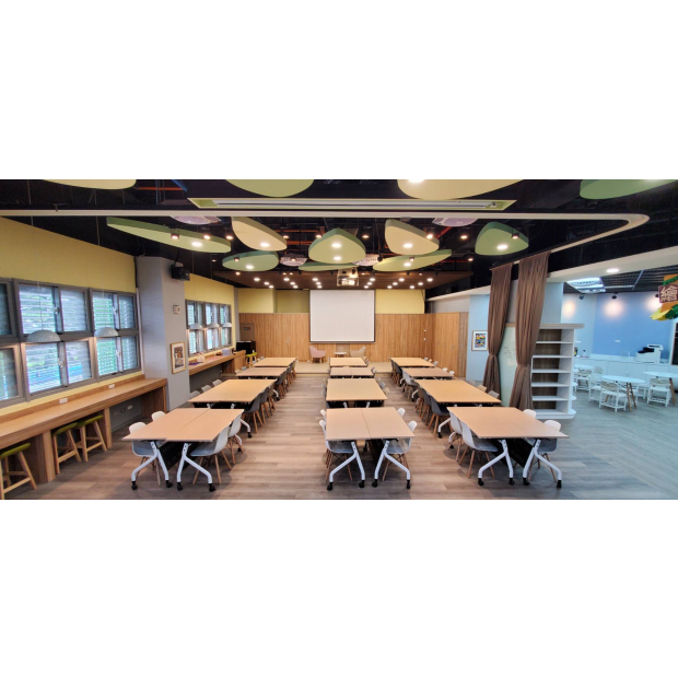 各區以不同造型天花劃分空間,包含「葉片造型天花」、「鋁障板格柵」與投影視聽系統結合設計, 即便是挑高空間,也精準施工到位,展現今城設計對學校工程的細膩掌握。